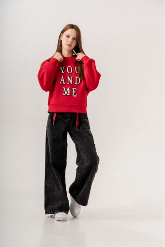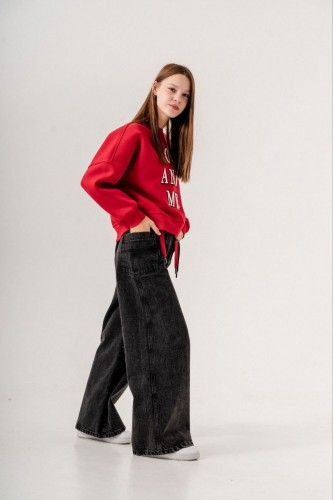 Kız çocuk beli lastikli ve kemerli bol paça kargo cep jean