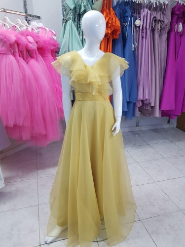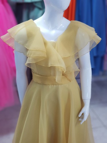 Kız çocuk omzu fırfır detaylı, içi pamuk astarlı abiye elbise