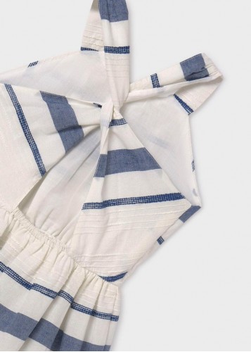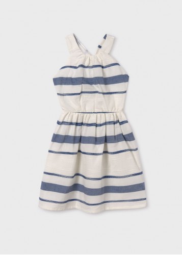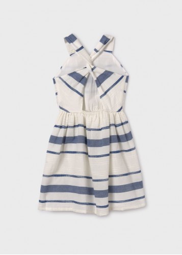 Kız çocuk sırt detaylı, çizgili keten elbise