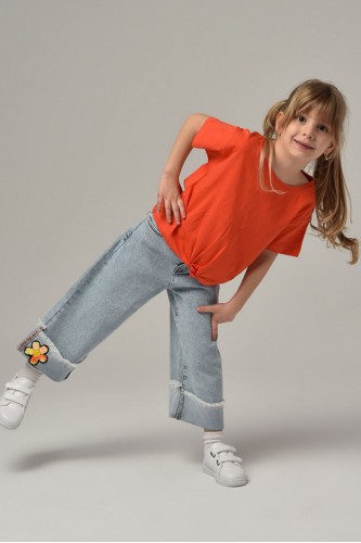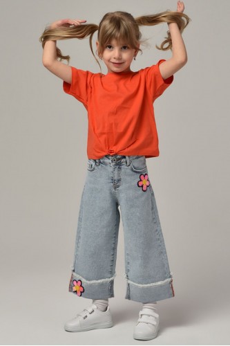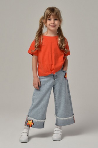 Kız çocuk turuncu çiçek işlemeli pantolon