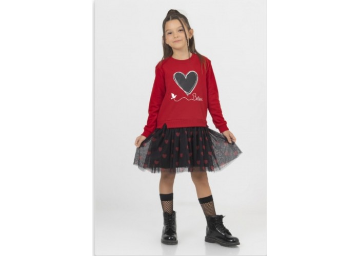 Üzeri kalp baskılı sweat, altı pamuk astarlı yumuşacık tütü etekli elbise