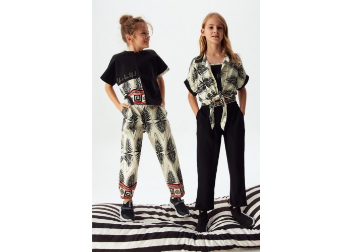 Üst: Uyumlu Baskı Detaylı Yumuşacık Pamuk Penye Crop Bluz:Bağlama Detaylı Kendinden Tasarım Detaylı Tiril Tiril Düğmeli Gömlek Alt: Belden Lastikli Özel Kesim Yumuşacık Tiril Tiril Pantolon