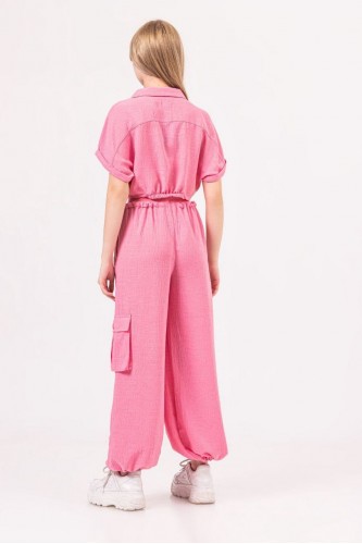 - 8-14 Yaş Kız Çocuk Bağlamalı Keten Crop Gömlek - Fuşya