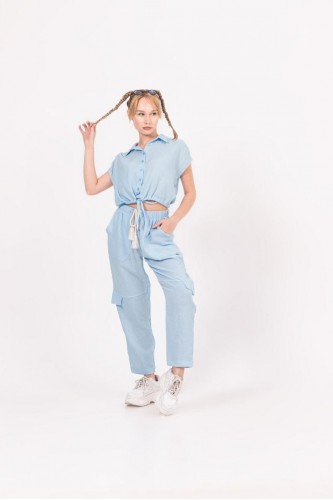 - 8-14 Yaş Kız Çocuk Bağlamalı Müslim Gömlek - Mavi