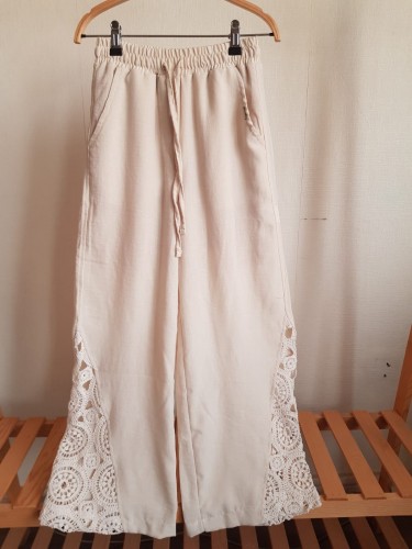 Kız çocuk beli lastikli, içi yarım astarlı, paçaları dantel işlemeli keten pantolon
