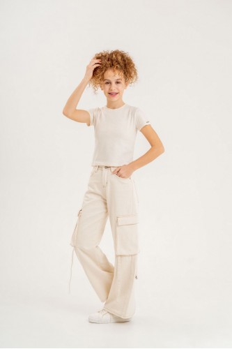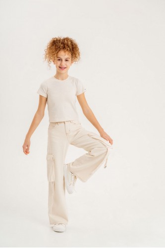Kız çocuk kargo cepli ekru jean
