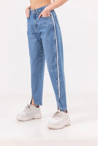 Kız çocuk paçası yırtmaç detaylı yüksek bel mom jean